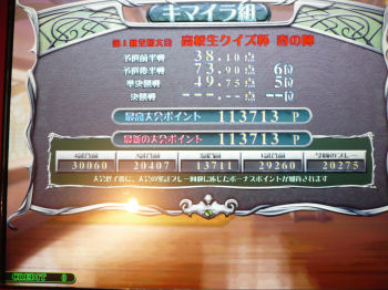 ポイント制になった今大会、最大で20万ptくらいの方がおりました。どうやら表示されるポイントの数値は直近連続5戦での合計の最大値が記録されているらしく、たとえばわたくしのポイントは上記SSの通り現在113713、次のプレイで30060以上取れなければ数値に変動無し。うーん、このくらいの実力なのでしょう、いまは。